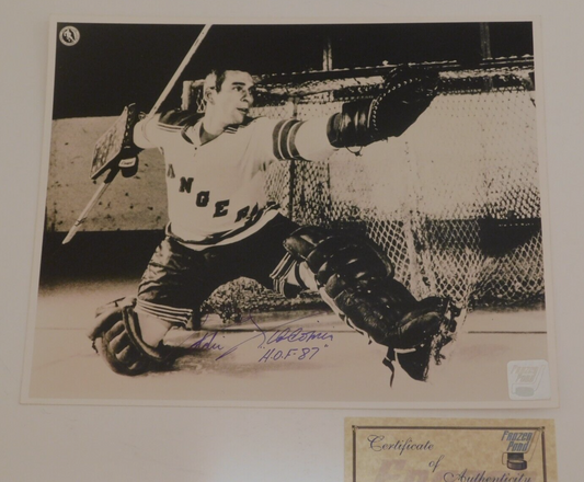 Eddie Giacomin Signed Autographed 8x10 Photo New York Rangers NHL HOF BW Frozen Pond COA