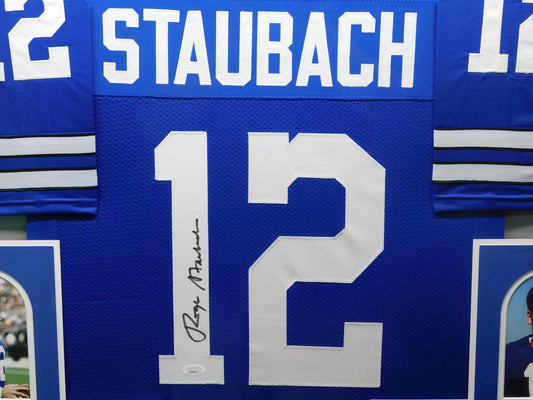 Roger Staubach Signed Autographed Framed Dallas Cowboys Blue Throwback Jersey HOF JSA COA