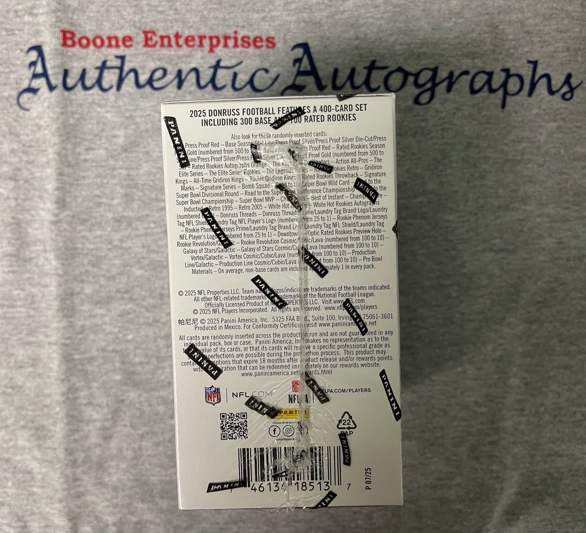 The 2025 Panini Donruss Football Sealed Blaster Box contains 90 cards featuring players from the National Football League (NFL). Manufactured by Panini, this box is part of the 2025 Donruss set and includes autograph authentication from Donruss. Perfect for football fans and collectors looking to add to their sports trading card collection, this sealed box offers the opportunity to potentially uncover rare and valuable cards. The excitement of opening packs of cards adds to the thrill of collecting and enjoying the players and moments from the 2025 football season.