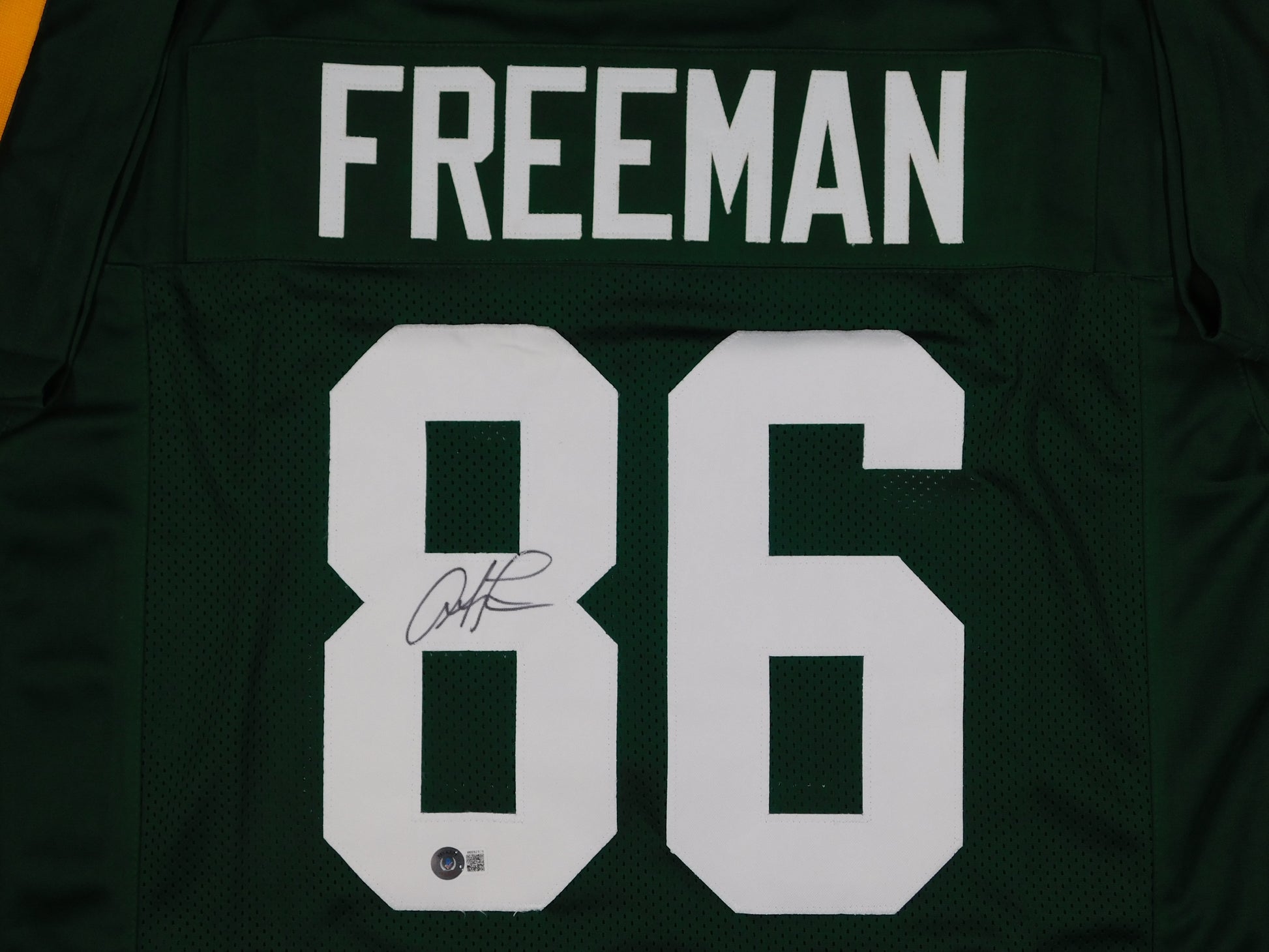 This is a custom Green Bay Packers football jersey signed by Antonio Freeman. The autograph is authenticated by Beckett Authentication Services (BAS) and the product is an original. This memorabilia is a must-have for fans of the NFL and collectors of sports memorabilia, specifically those interested in the Green Bay Packers. The jersey serves as a unique and authentic piece of signed memorabilia that commemorates Freeman's time with the team.