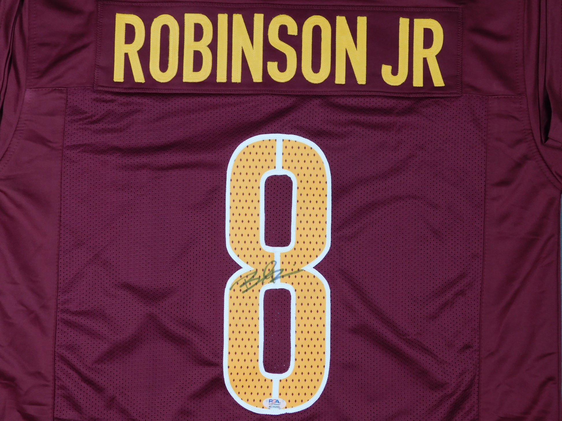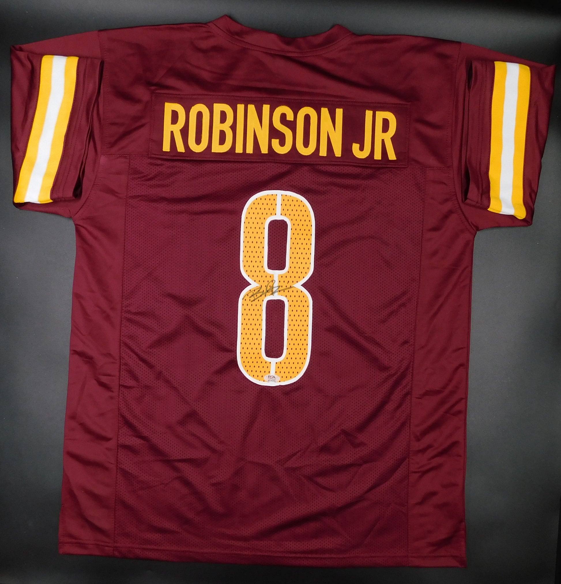 This is a Brian Robinson Jr. signed custom Washington Commanders football jersey with authentication from Professional Sports Authenticator (PSA). This original autographed jersey featuring the player's signature is a valuable collectible for fans of football and the Washington Commanders. As a trusted certification authority, PSA ensures the authenticity of the signature, making this jersey a desirable item for collectors and fans of the sport.