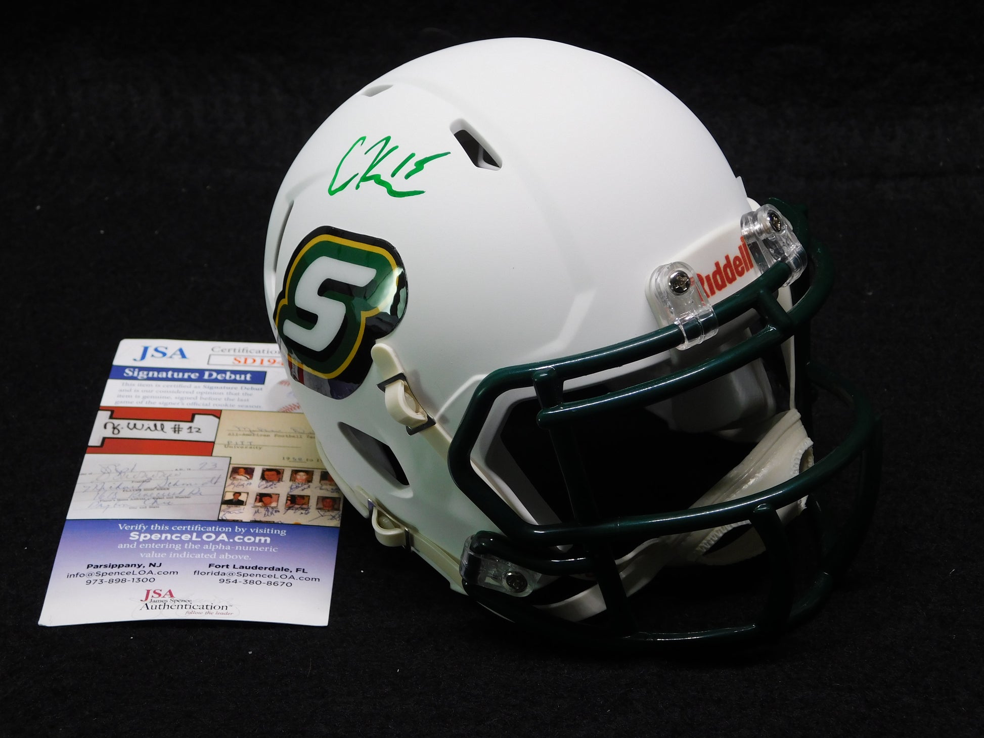 This is a Cole Kelley signed Southeastern Louisiana Lions speed mini helmet, authenticated by James Spence Authentication (JSA). This collectible item is a must-have for fans of football and the Southeastern Louisiana Lions. The autograph adds an extra value and authenticity to the helmet, making it a unique piece of sports memorabilia for any fan or collector. Displaying this signed helmet in your home or office is a great way to show your support for the team and player.