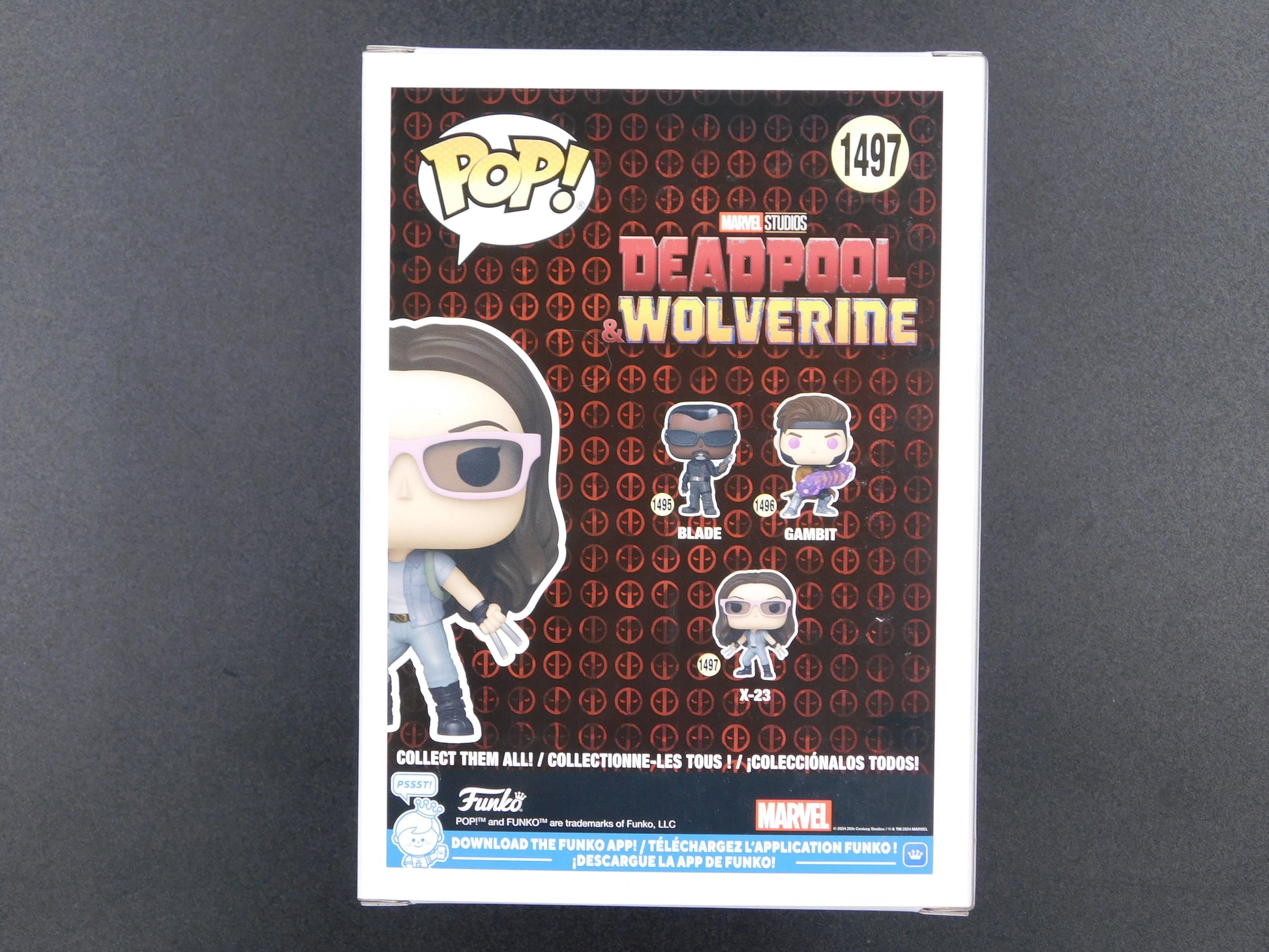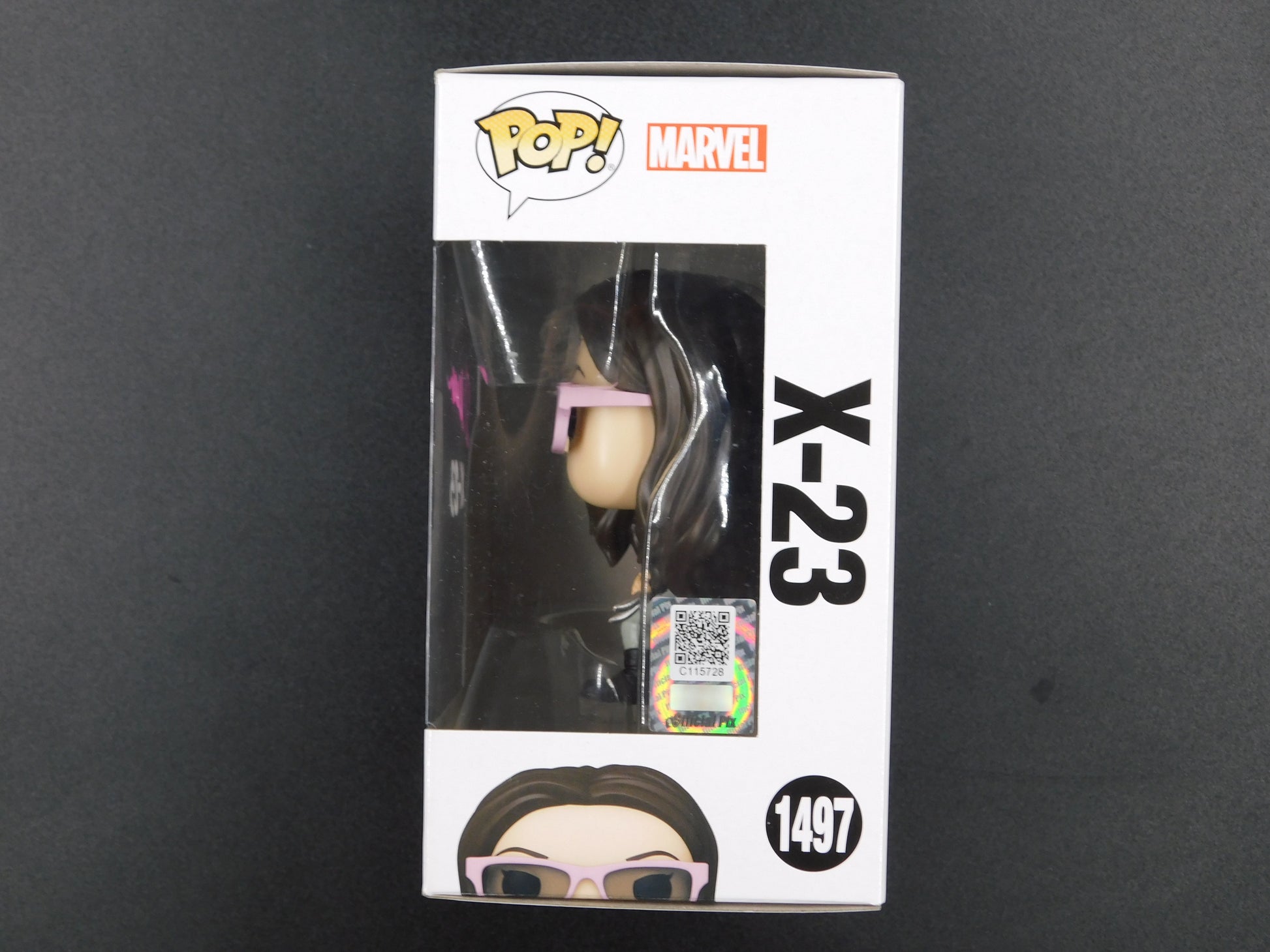 This is a signed Funko Pop figure of X-23 from the Deadpool and Wolverine movies, signed by actress Dafne Keen. The autograph is authenticated by Official Pix and comes with a Certificate of Authenticity. This collectible item is a great piece of entertainment memorabilia for fans of the Marvel superhero genre, specifically for those who are fans of Deadpool and Wolverine. The figure is an original piece, making it a valuable and unique addition to any movie memorabilia collection.