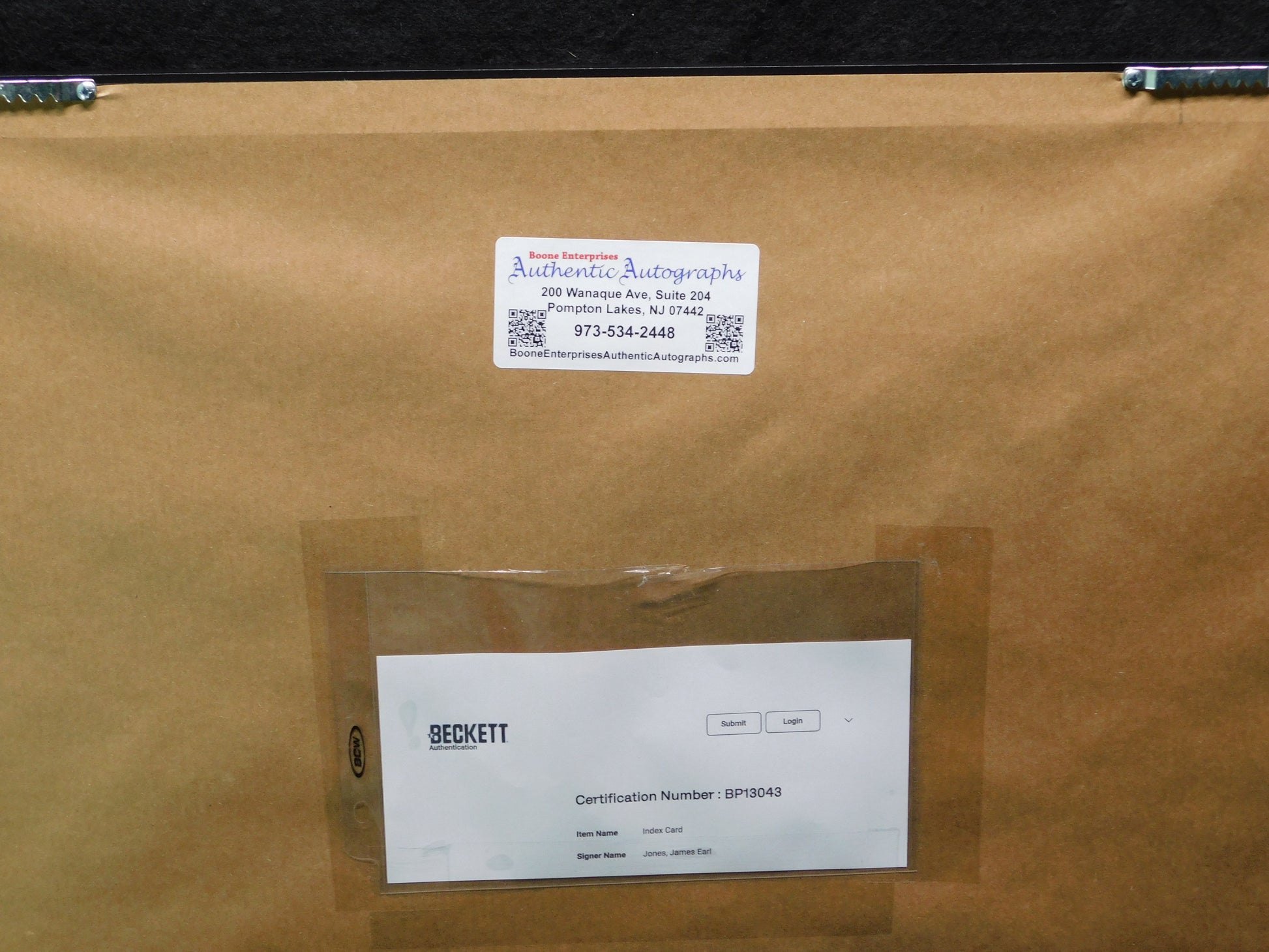 This is a framed display featuring an autograph of the iconic James Earl Jones, signed as Darth Vader from the Star Wars franchise. The autograph has been authenticated by Beckett and comes with a Certificate of Authenticity. The QR code that Beckett puts on items to authenticate them is on the back of this piece and cannot be seen while framed. Attached to this piece is the print out from the Beckett website showing the authenticity of this piece. This is a unique and collectible piece for fans of the iconic character and movie series.