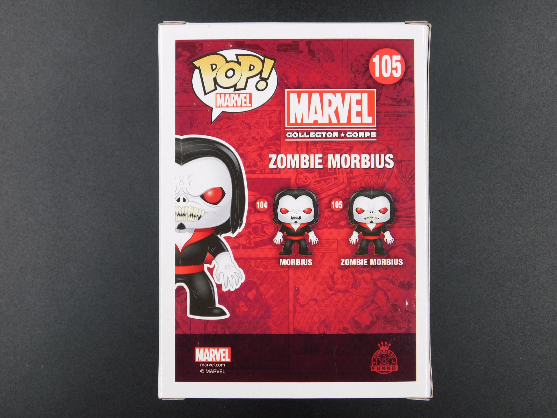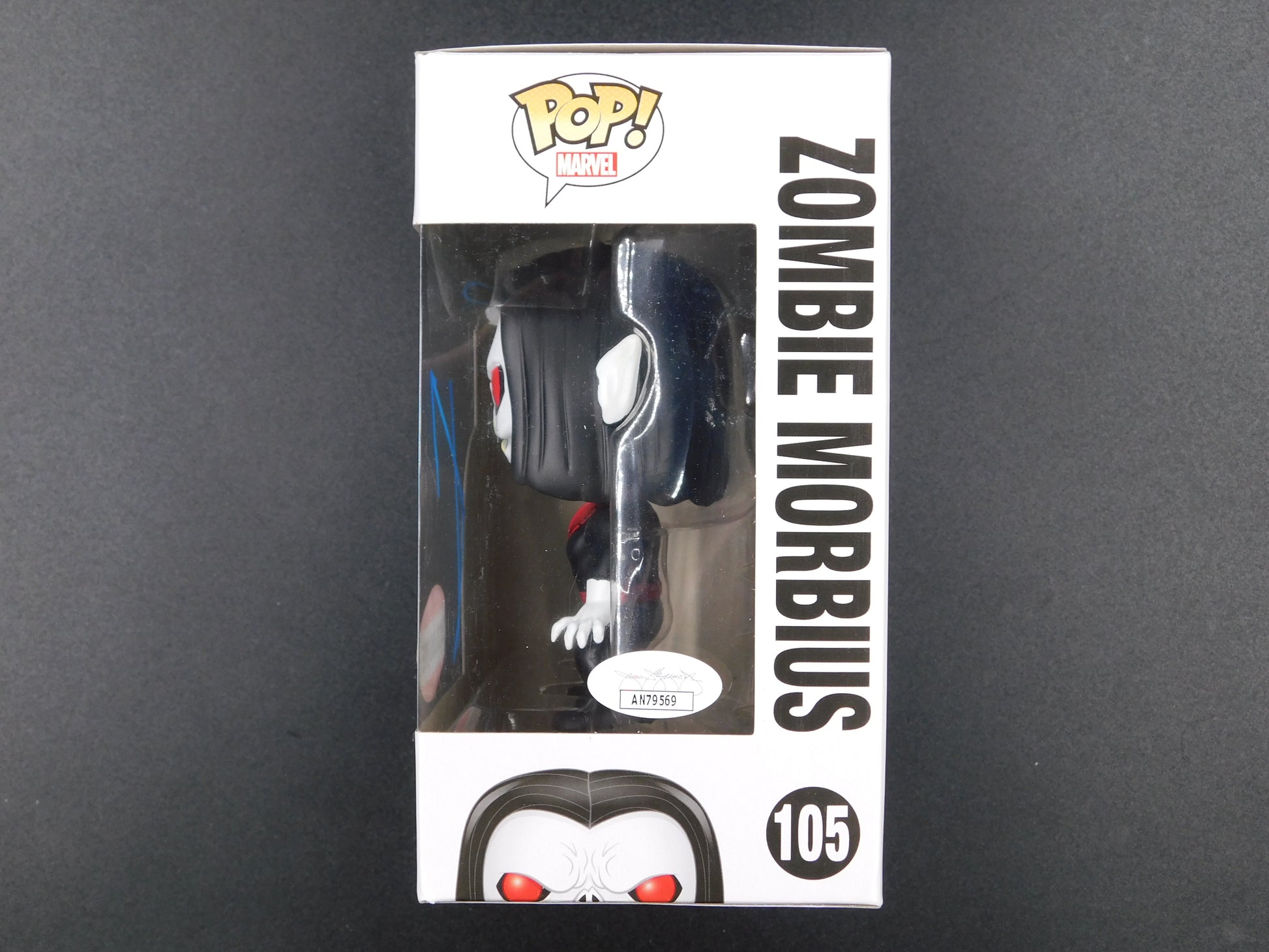 This is a Jared Leto signed Funko Pop 105 Zombie Morbius from the movie "Morbius." The autograph is authenticated by James Spence (JSA) and is considered original. This item is a rare and collectible piece of entertainment memorabilia for fans of Jared Leto and the movie "Morbius."