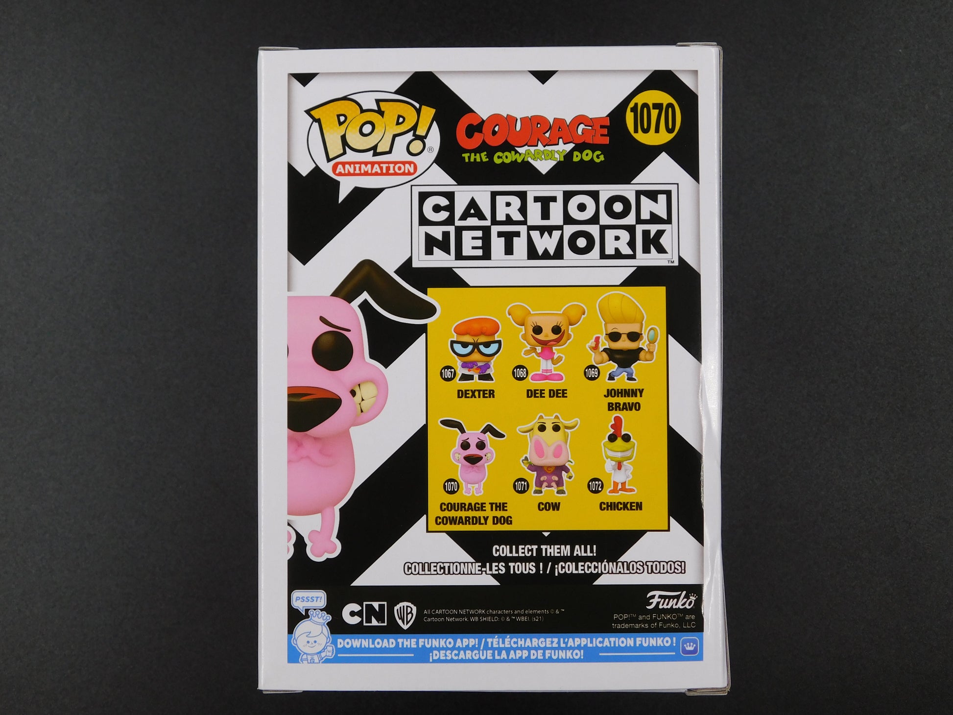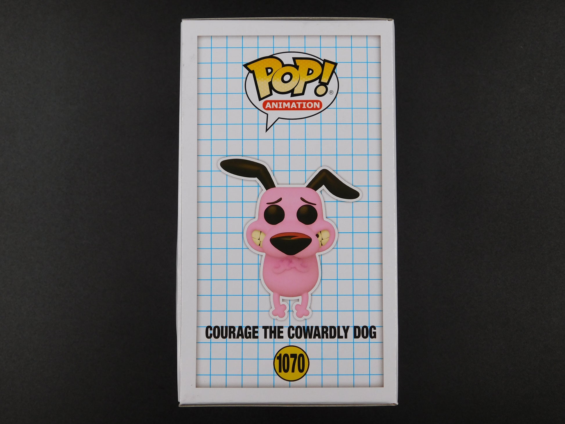 The product is a Funko Pop figure of Courage The Cowardly Dog that features a unique artwork sketch by Jeff Brennan. This Funko Pop figure is signed by Jeff Brennan, adding a personalized touch to the collectible item. As an original piece, it holds a special value for fans of the television show and collectors of entertainment memorabilia.