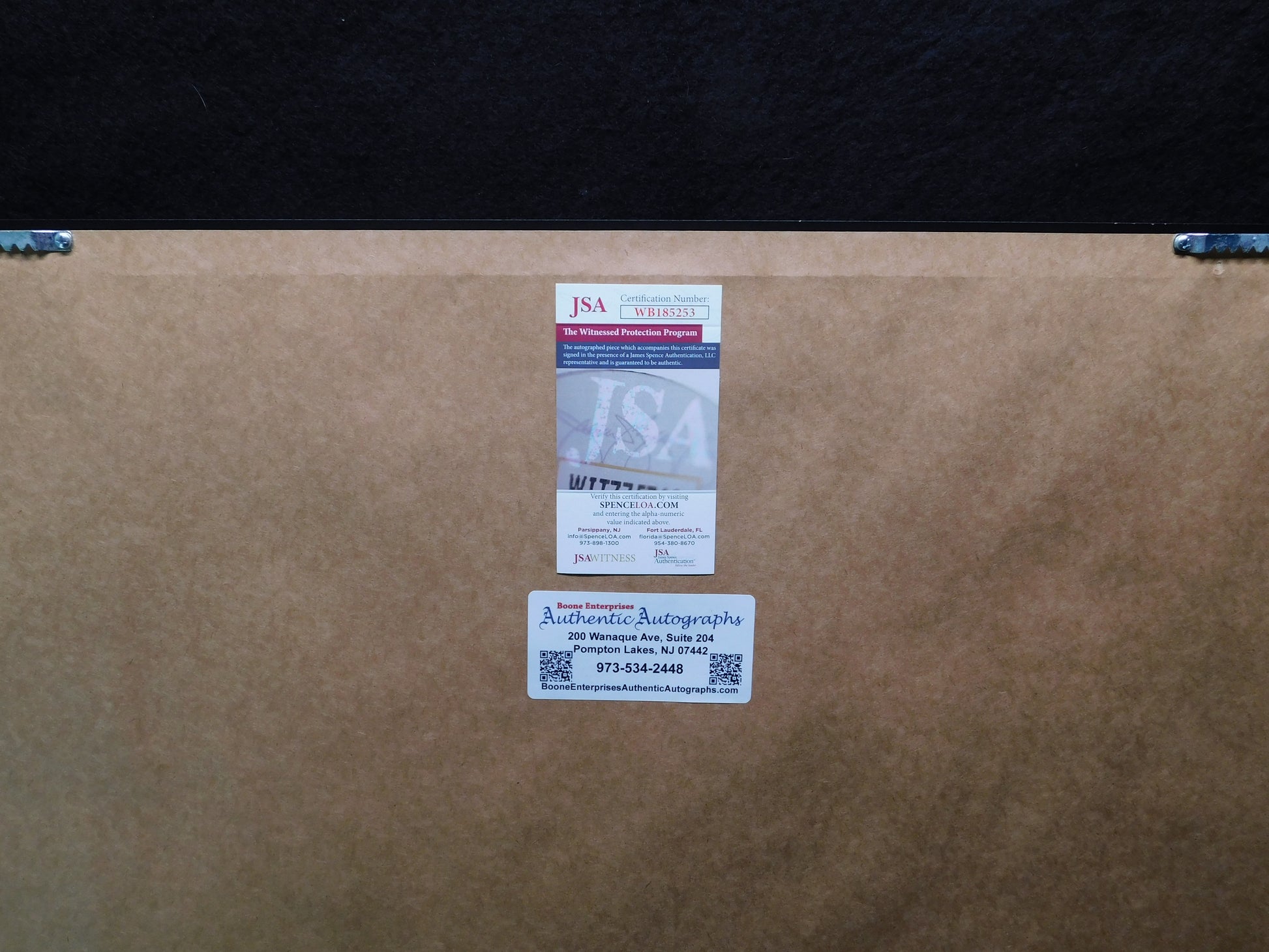 This is a framed 16x20 photo of Jimmy Vesey, an autographed New York Rangers hockey player. The autograph has been authenticated by James Spence Authentication (JSA), ensuring its authenticity. This collectible item is a must-have for fans of the New York Rangers and hockey enthusiasts.
