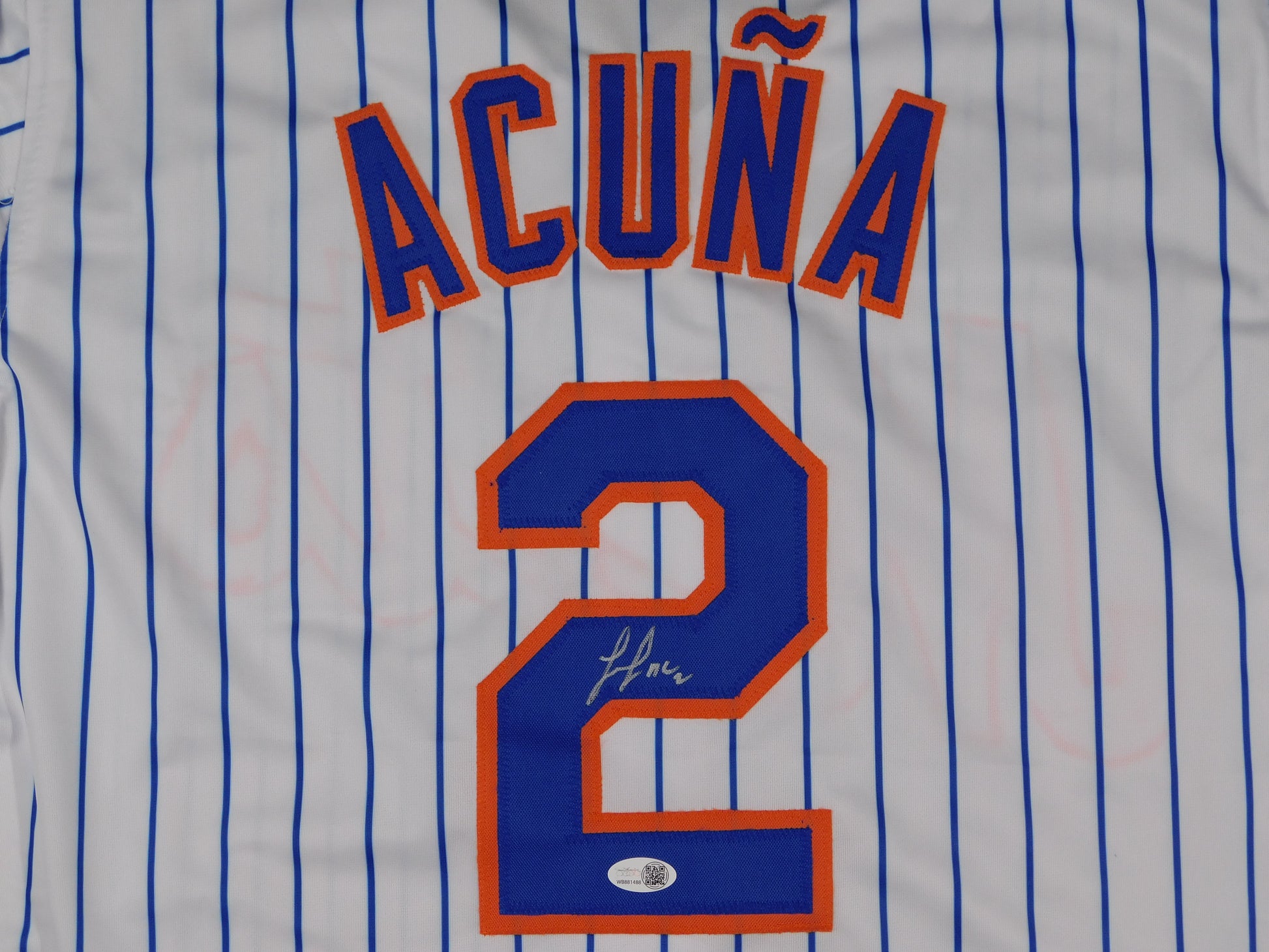 This is a Luisangel Acuña autographed custom New York Mets pinstripe baseball jersey with James Spence Authentication (JSA) certification. This original autographed jersey is a unique and valuable collectible for fans of baseball and the New York Mets. The autograph from the player adds a personal touch to the item, making it a special piece for any sports memorabilia collection.