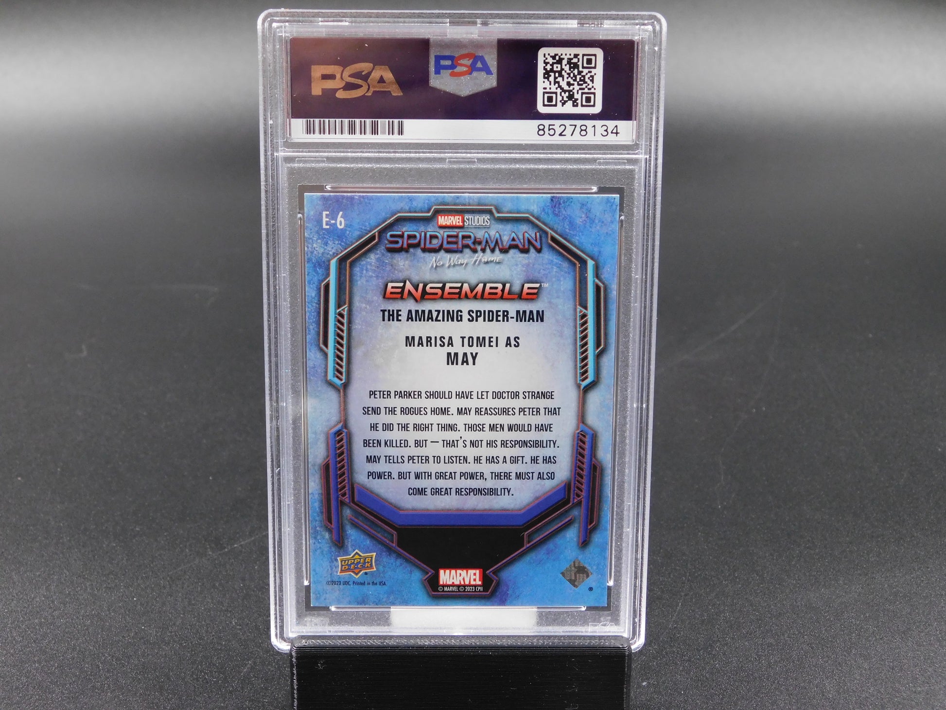 Capture a piece of cinematic history with this Marisa Tomei autographed Spider-Man No Way Home Upper Deck card. Celebrating her role as May Parker, this card is a must-have for fans and collectors alike. Authenticated by PSA, the card features a label or sticker autograph, ensuring its authenticity and preserving the integrity of the collectible. The card, numbered E-6, is part of the Marvel Studios Spider-Man set and comes in standard card stock size. It's an original, vintage piece from the year 2023, making it a contemporary collectible with a timeless appeal. The card is in English and showcases Marisa Tomei's signature, adding a personal touch from the actress herself.