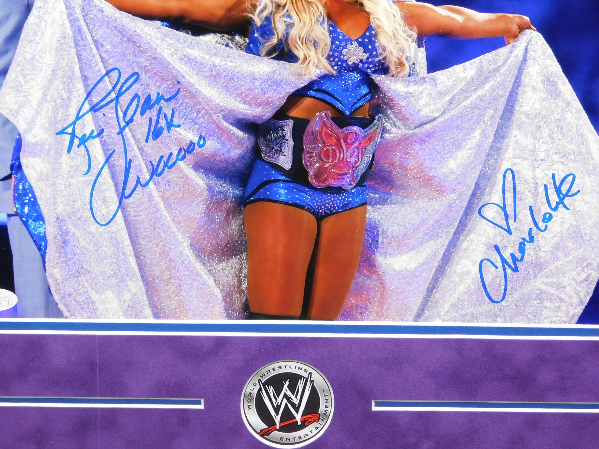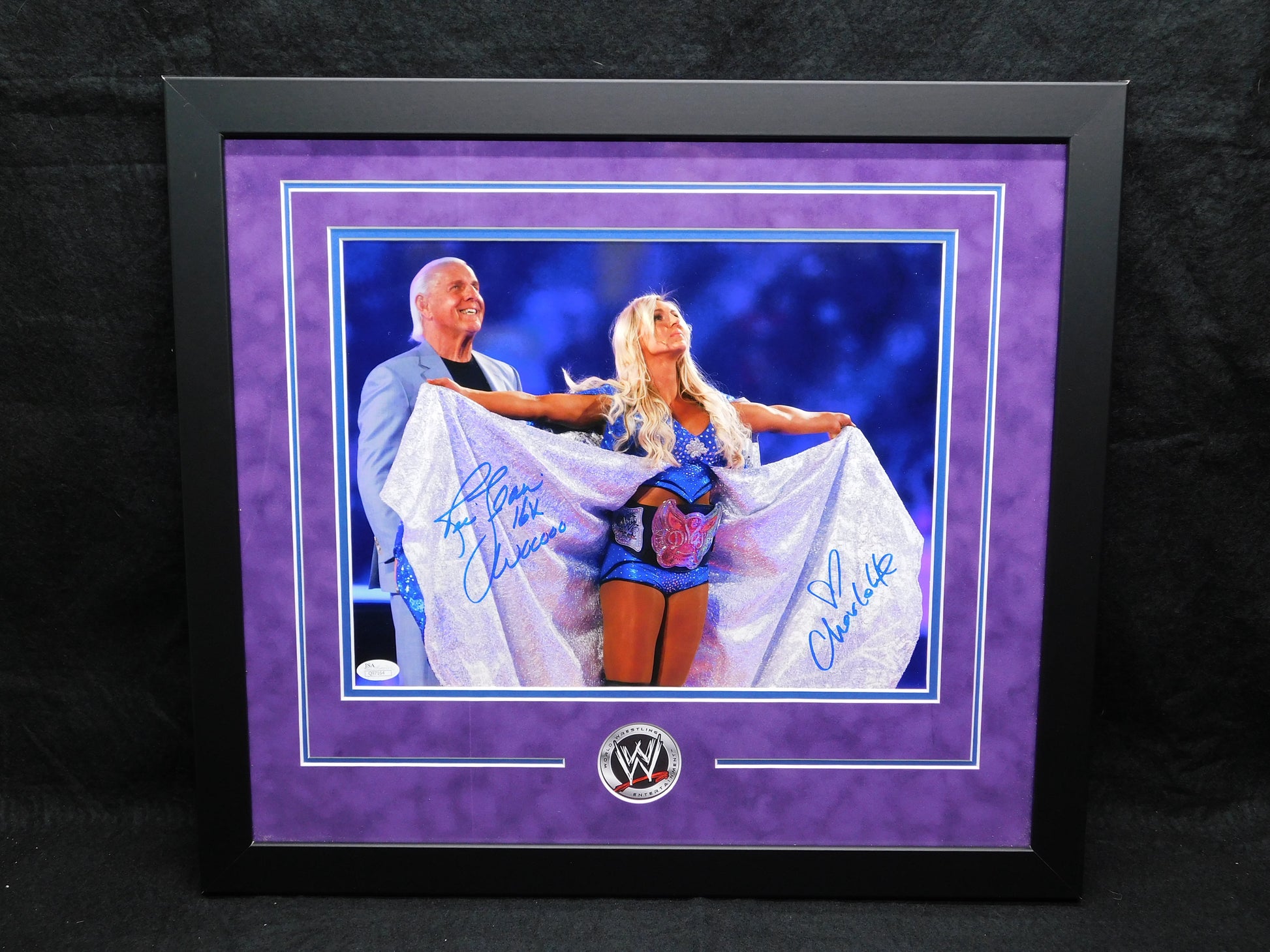 Capture a piece of wrestling history with the Ric & Charlotte Flair Dual Signed Framed 11x14 Photo. This collectible showcases the iconic Ric Flair, accompanied by his daughter Charlotte, both signatures verified by James Spence Authentication (JSA) for absolute authenticity. It's an original item that celebrates the legacy of these wrestling legends. The photo, professionally framed and presented, would make a stunning addition to any fan's collection or as a standout display piece in your home or office. With the inclusion of a JSA Certificate of Authenticity, you can be confident in the genuine nature of this prized possession, immortalizing the flair and excitement of WWE and WWF lore.