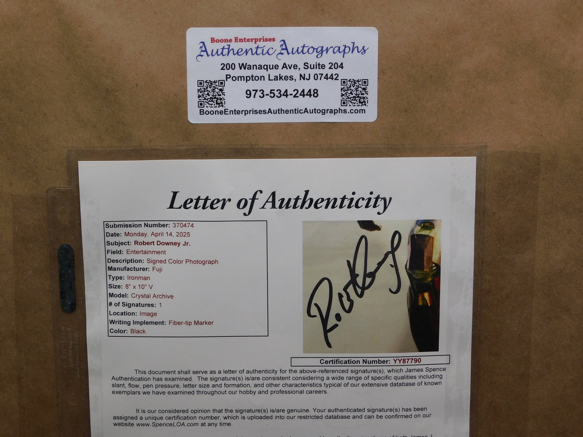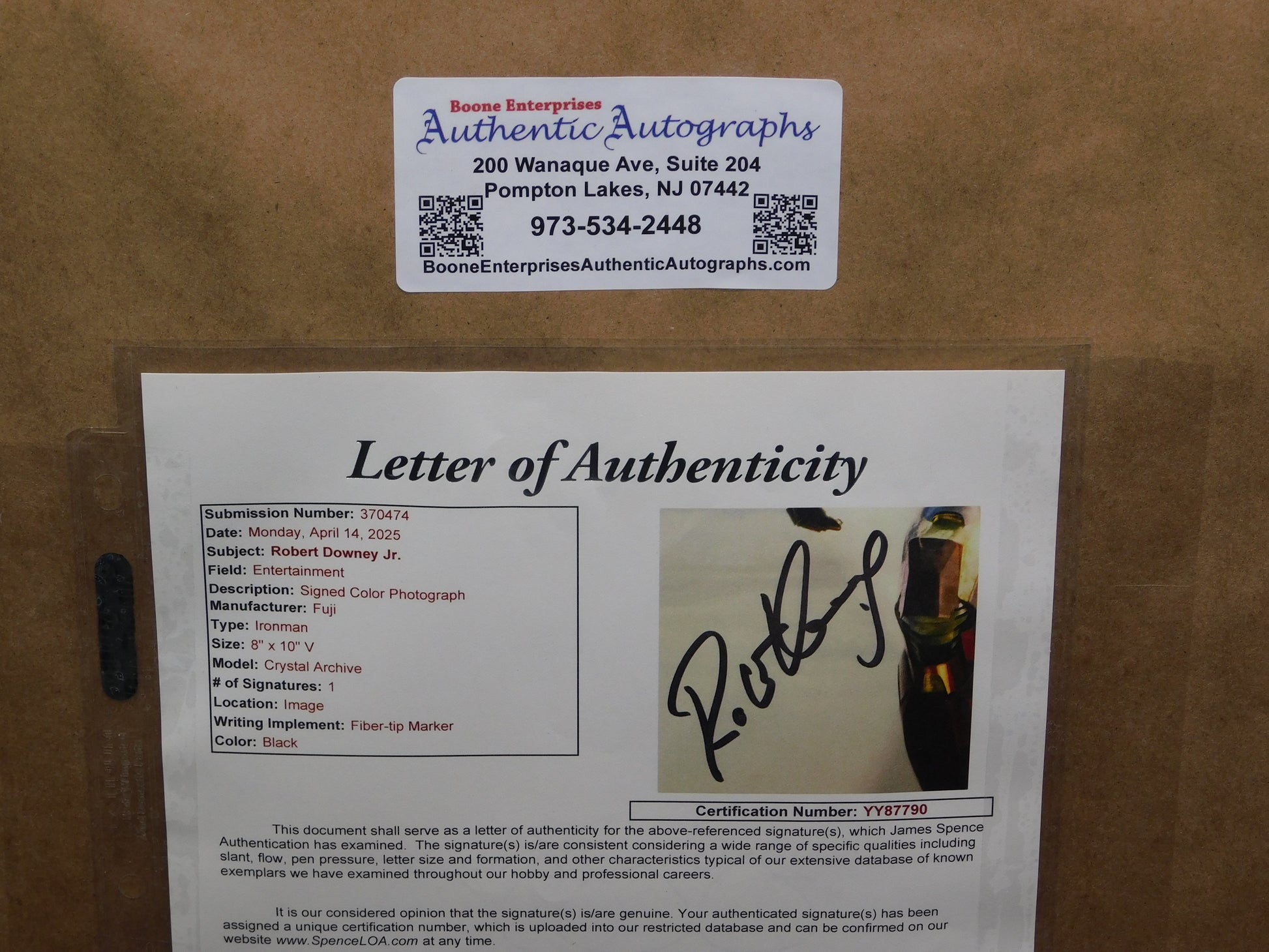 This is a framed 8x10 photograph of Robert Downey Jr, signed by the actor himself with his full name autograph. The autograph is dual authenticated by James Spence (JSA) and SWAU and the photograph features Robert Downey Jr in his iconic role as Tony Stark in the Marvel movie "Iron Man". This collectible item is an original piece and a must-have for fans of the actor and the Marvel movie franchise.