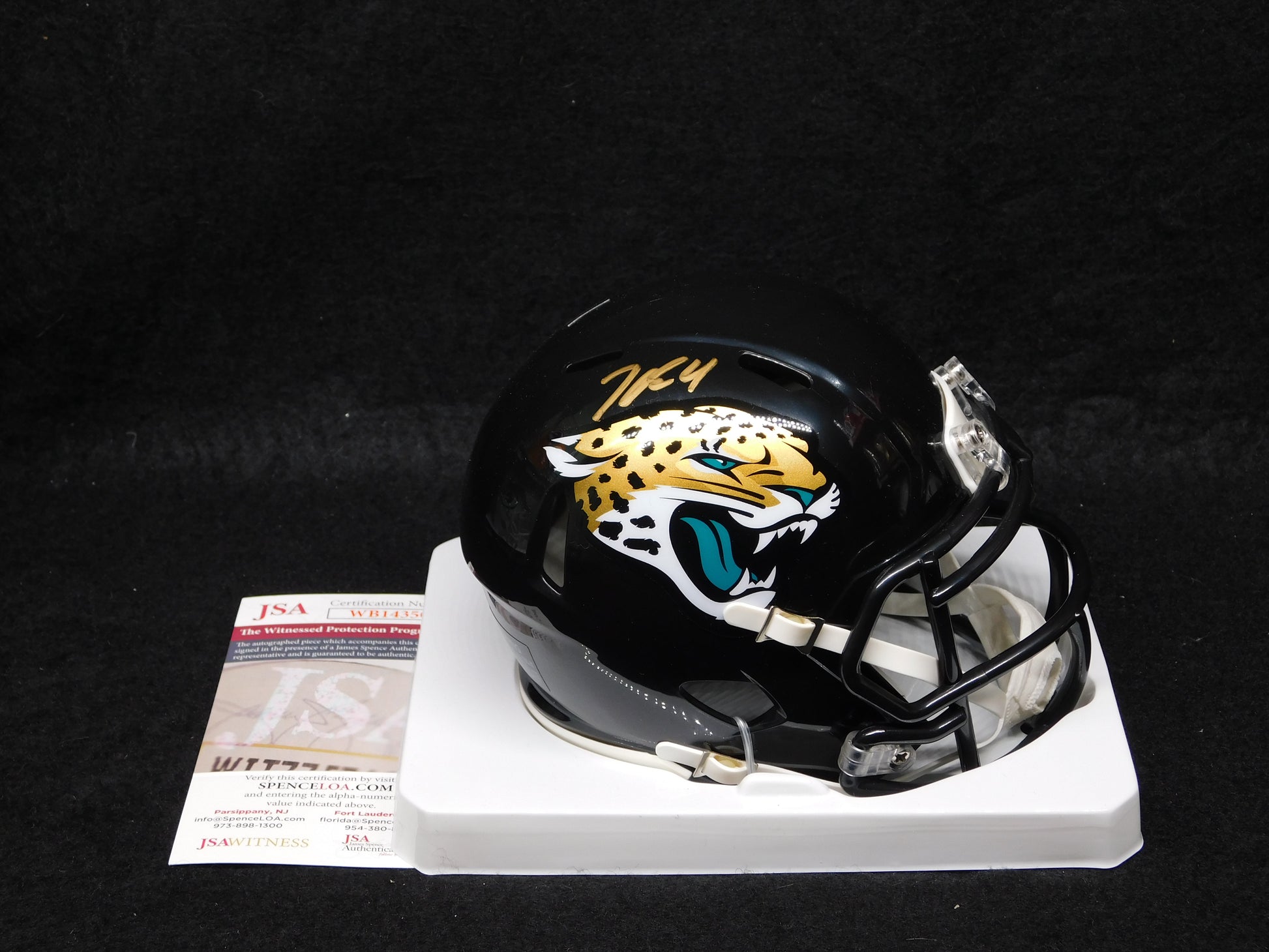 This is a Tank Bigsby signed Jacksonville Jaguars speed mini helmet with authentication from James Spence Authentication (JSA). This original autograph adds value to the collectible item for football fans and collectors alike. The helmet represents the player's signature on behalf of the Jacksonville Jaguars team, making it a coveted piece for fans of the NFL team.
