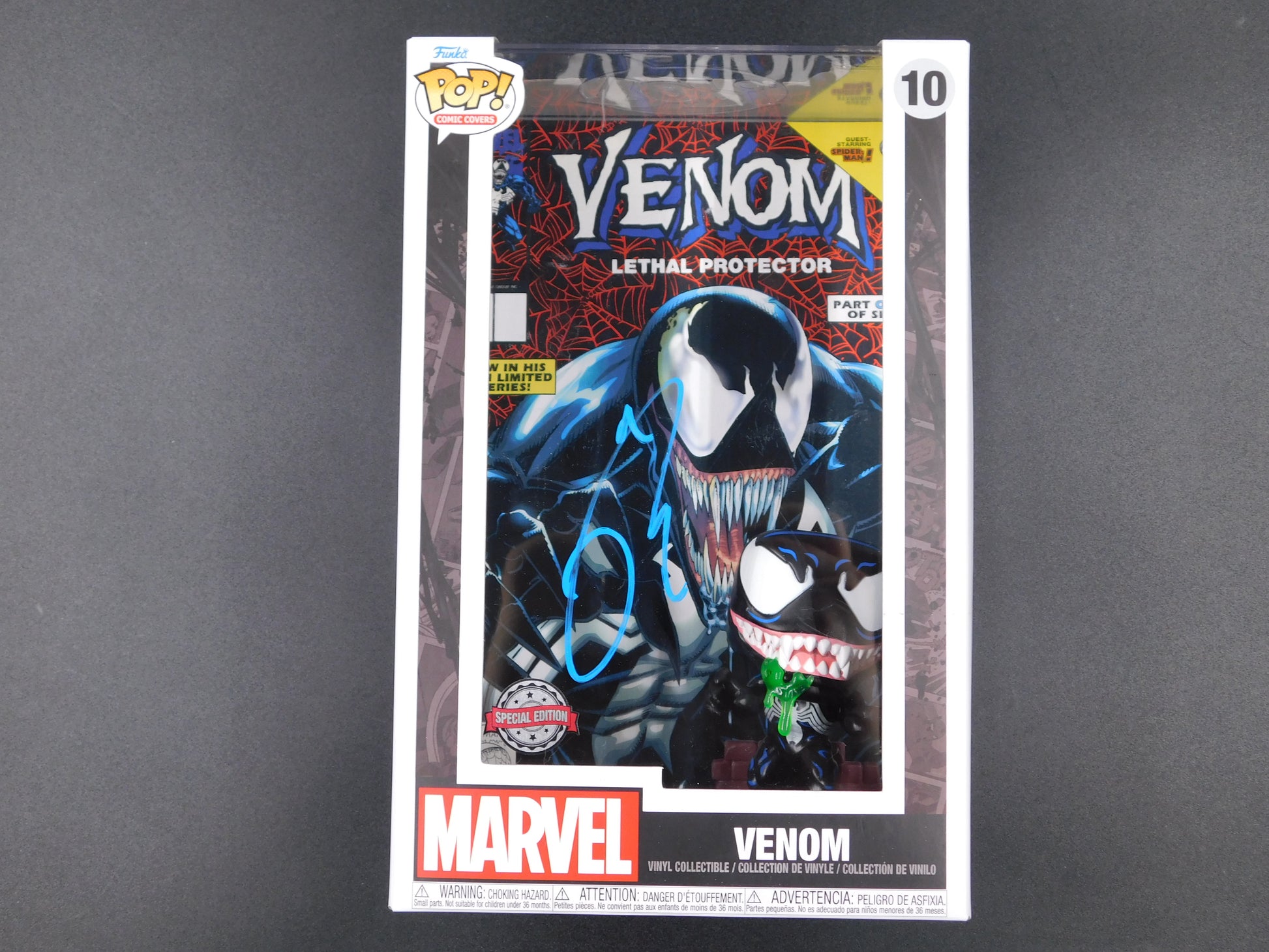This is a Tom Hardy signed autographed Funko Pop 10 Venom comic book cover featuring the character Venom from the Marvel franchise. The autograph has been authenticated by James Spence (JSA) and the originality of the signature is guaranteed. This collectible item is a must-have for fans of Tom Hardy and Marvel enthusiasts alike, as it adds a unique touch to their entertainment memorabilia collection.