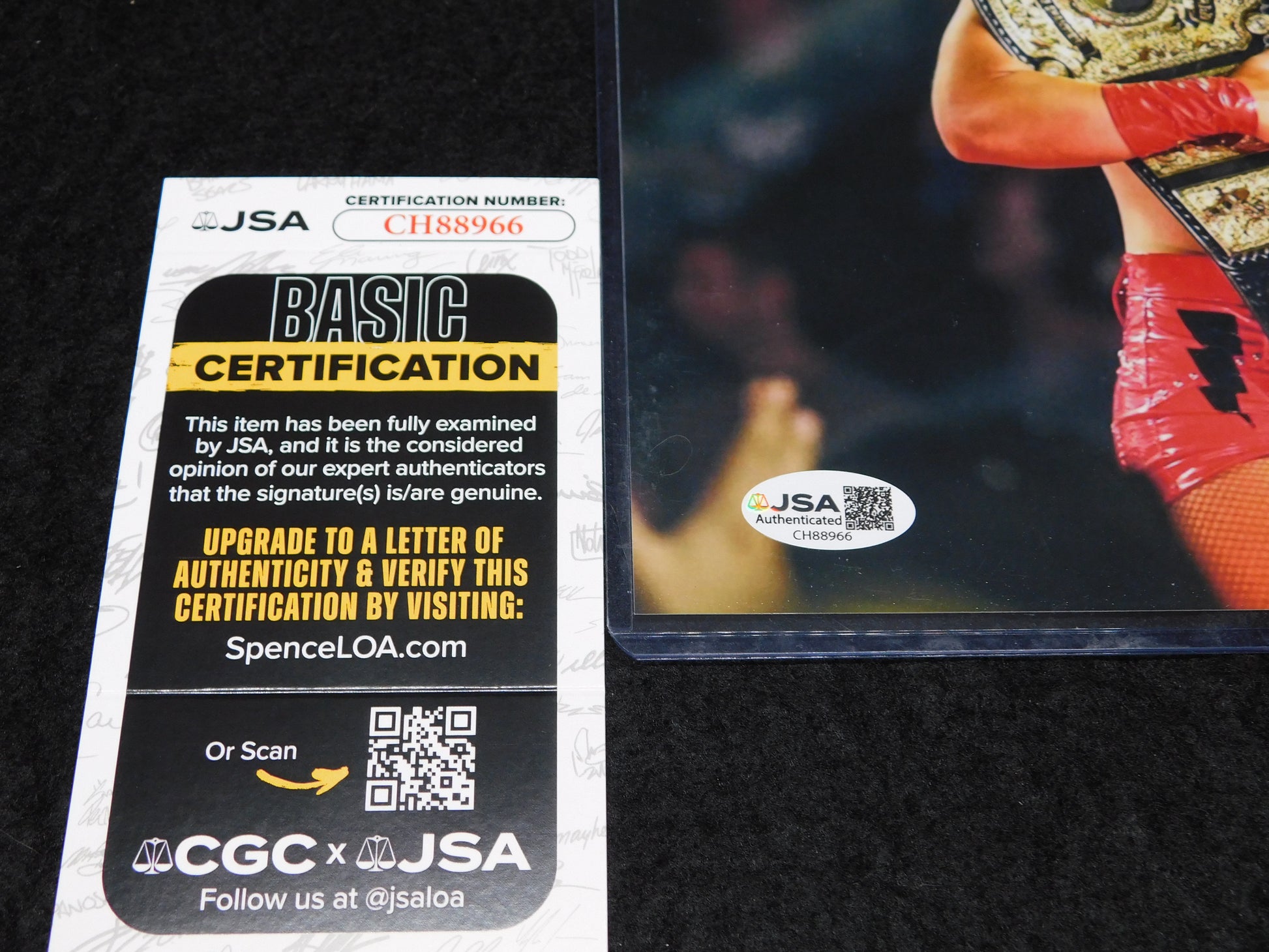 The product is an 8x10 photo of Toni Storm, a women's wrestling champion in AEW, signed by the athlete herself. This autographed photo comes with Authentication from James Spence Authentication (JSA), guaranteeing its authenticity. Perfect for fans of wrestling and collectors of memorabilia.