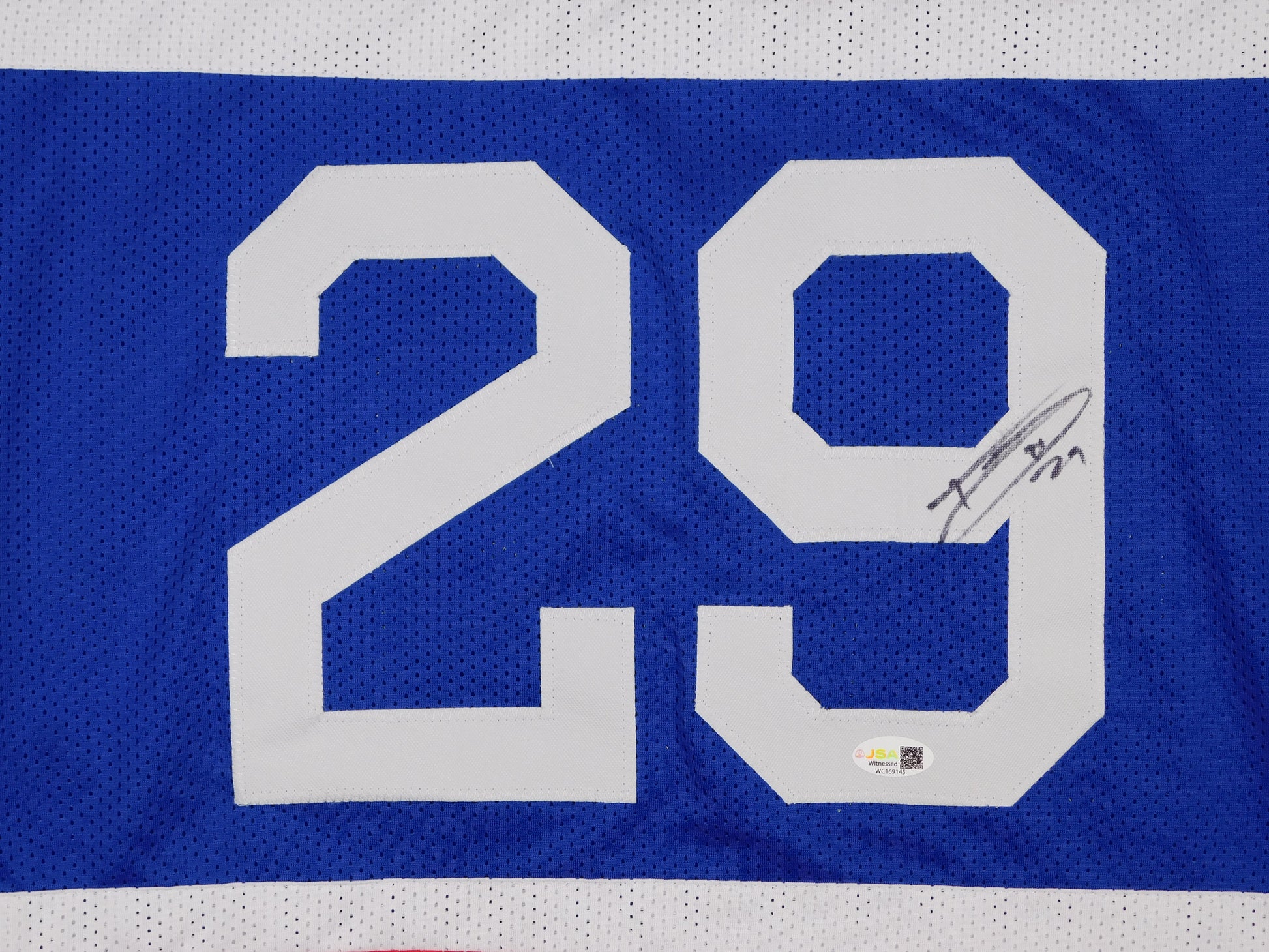 This is a Tyrone Tracy Jr. autographed custom New York Giants jersey, authenticated by James Spence Authentication (JSA). This original autographed jersey is a must-have for fans of the New York Giants and football enthusiasts alike. The signature of Tyrone Tracy Jr. adds a unique touch to this collectible piece, making it a valuable addition to any sports memorabilia collection.
