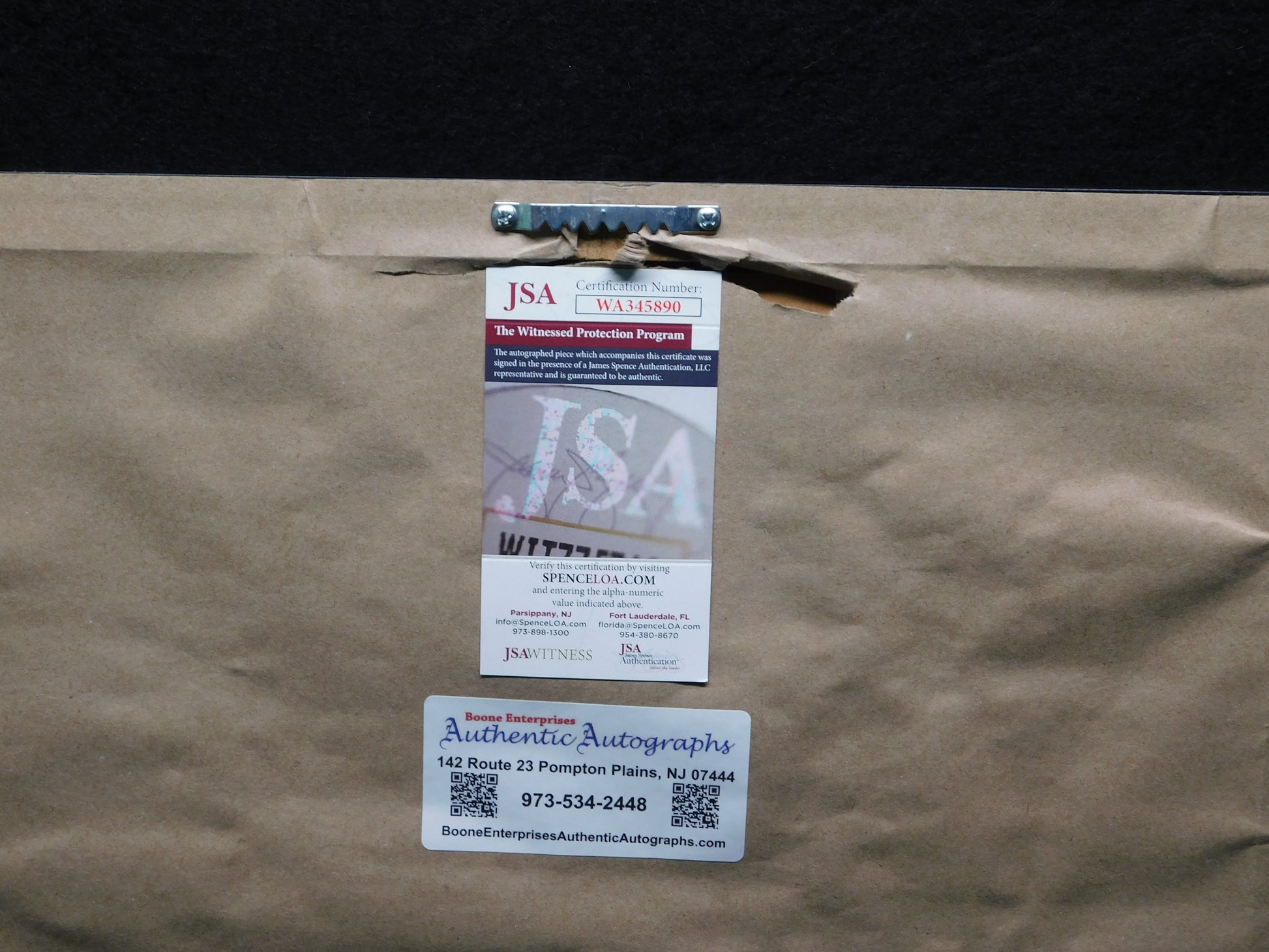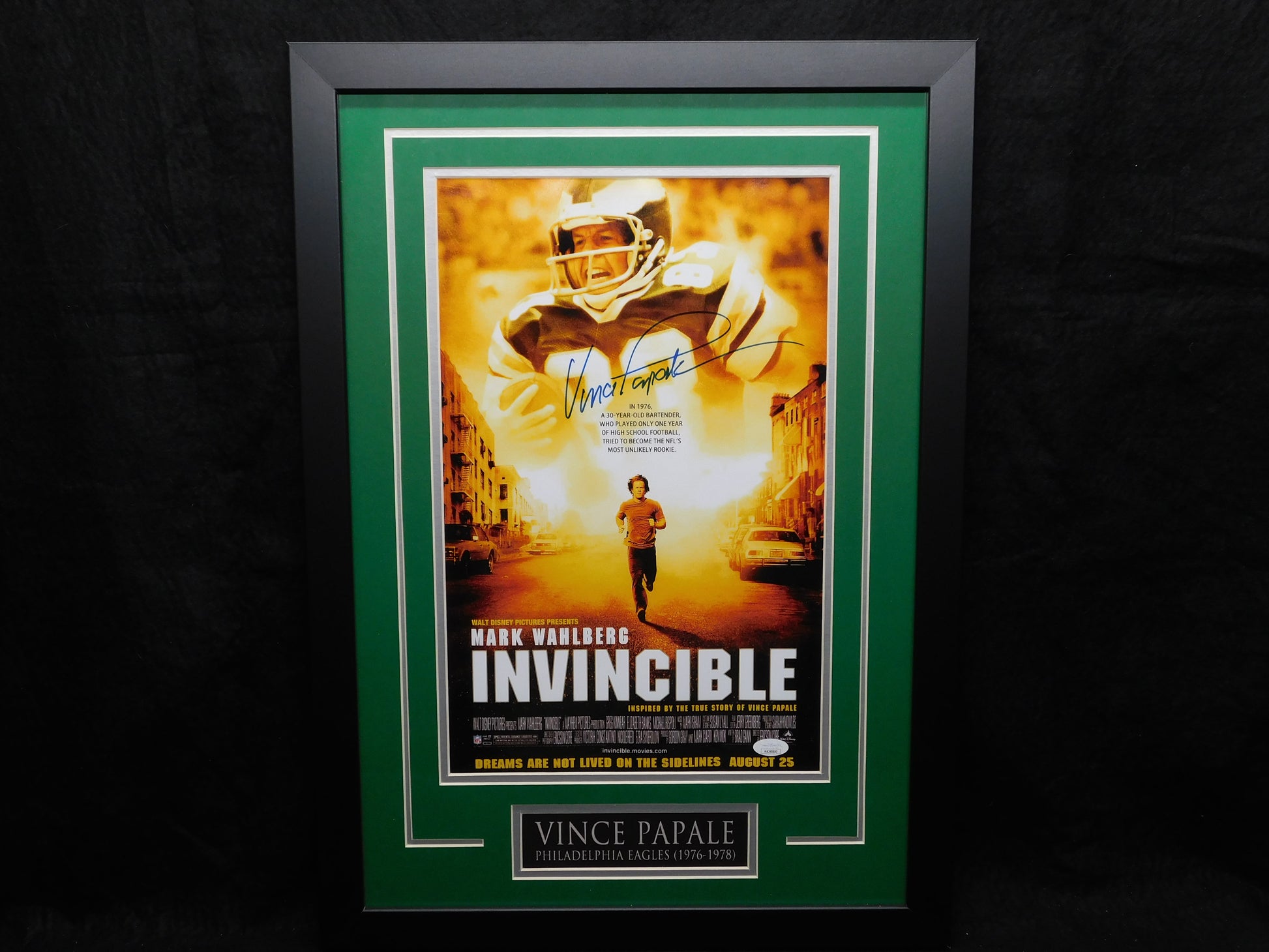 This is an 11x17 photo movie poster featuring Vince Papale, a notable figure in football history. This autographed framed piece is authenticated by James Spence Authentication (JSA) and showcases Papale's signature, making it a valuable collectible for fans of both football and the Philadelphia Eagles. Perfect for displaying in a sports memorabilia collection or as a unique piece of fan decor, this item captures a piece of NFL history with a touch of authenticity.
