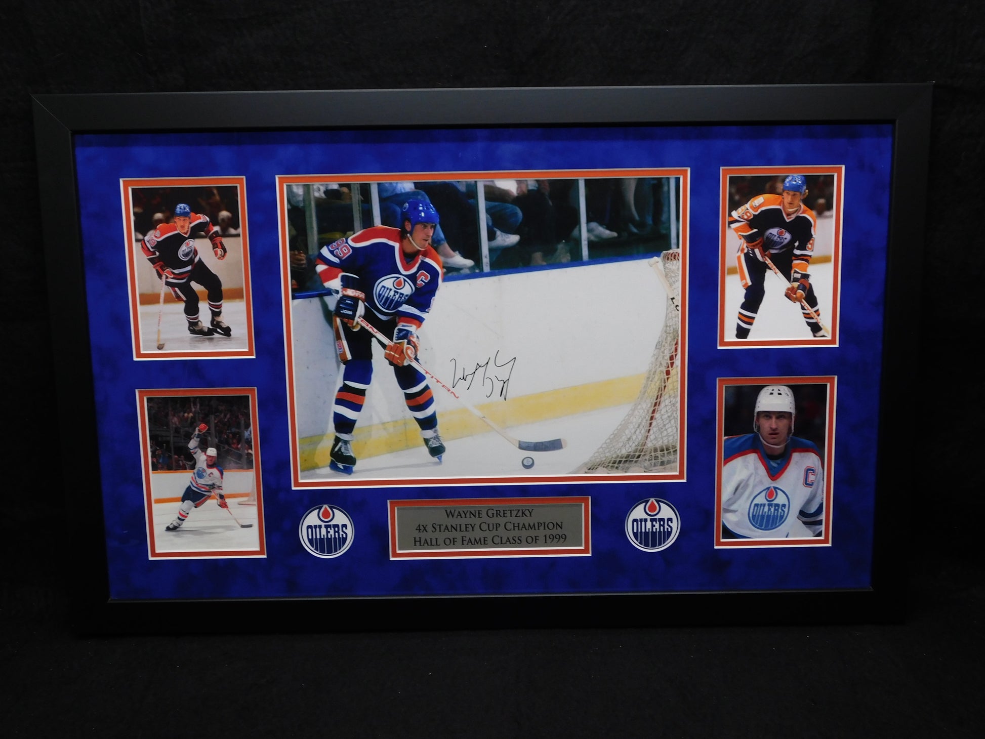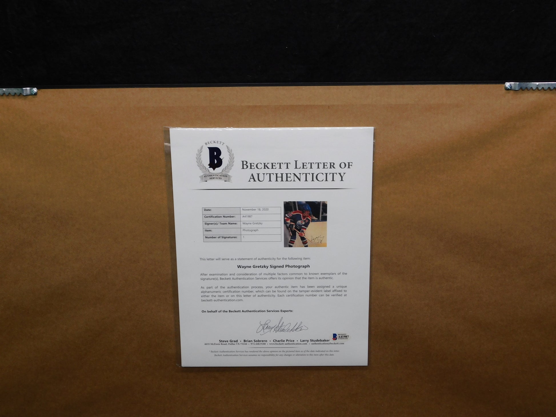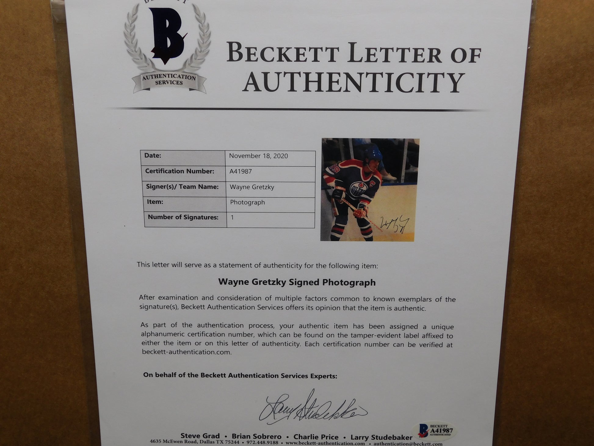 This is an authentic Wayne Gretzky signed framed photo, featuring the Great One during his time with the Edmonton Oilers. The autograph has been officially certified by Beckett Authentication Services (BAS), making it a valuable piece for any hockey fan or collector. This original piece captures a moment in hockey history, making it a treasured item for fans of Wayne Gretzky and the sport of hockey.